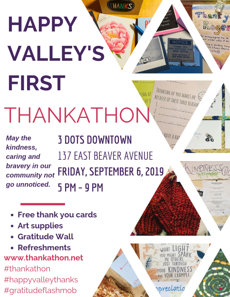 Happy Valley’s first Thankathon has a mission to ensure that the kindness, caring actions, and bravery that happens in our community does not go unnoticed. Do you have a great neighbor that helped you when you crashed your bike, a teacher that made a positive difference, a co-worker that always has helpful advice – participate in the Thankathon and let them know! At the Thankathon, there will be free thank you cards, a ton of art supplies to use to craft your own, and a PostSecret-style wall of thanks. Come by to brighten people’s day with thank you cards, help us meet our goal of 1,000 thank you’s in our community, and learn about who and what is making a positive difference in our community from the Gratitude Wall.